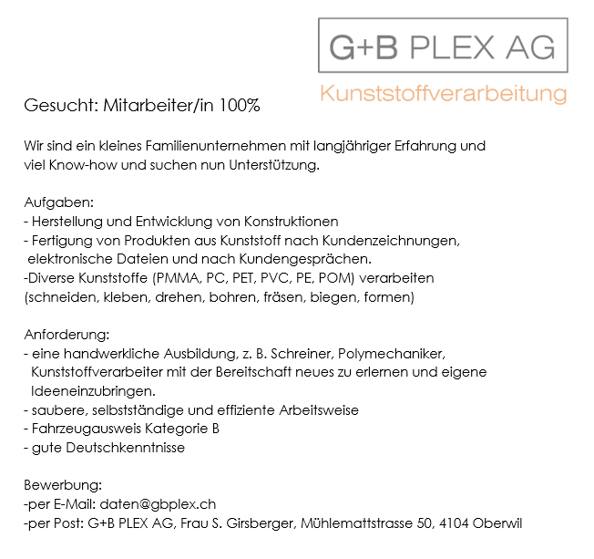 G + B Plex AG – Kunststoffverarbeitung in Oberwil Erfahren Sie hier mehr über unsere vielfältigen Produkte rund um den Kunststoff. Wir freuen uns auf Ihren Anruf.